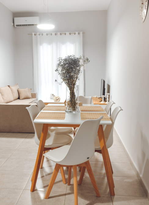 THALASSA ALMYROS APARTMENTS KALAMATA is a complex of three apartments on the beach of Almyros, just 50 meters from the sea. On the one hand the view of the beautiful Kalamata and on the other the Verga that overlooks the Messinian gulf. Each of our apartments is equipped with a complete household appliance (refrigerator, kitchen, oven, washing machine, coffee maker, etc.) and all the necessary utensils for the preparation of a meal. They also have flat screen TV, air conditioning, wireless wifi and parking with easy access for people with mobility problems and parents with prams.